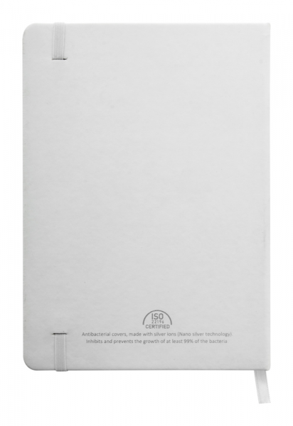 A5 Notizbuch mit antibakteriellem Kunstleder überzogen, mit Lesezeichen, Gummiband und 80 Seiten (blanko). Enthält Nanosilberzusatz, der das Bakterienwachstum auf dem Cover des Notizbuches verhindert. ISO 22196:2011 konform.
