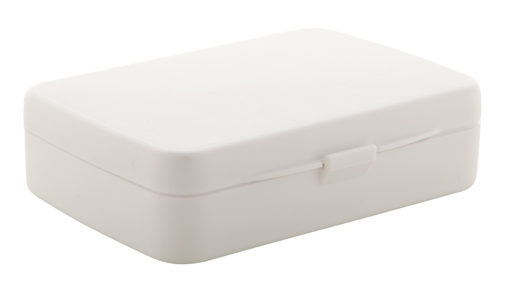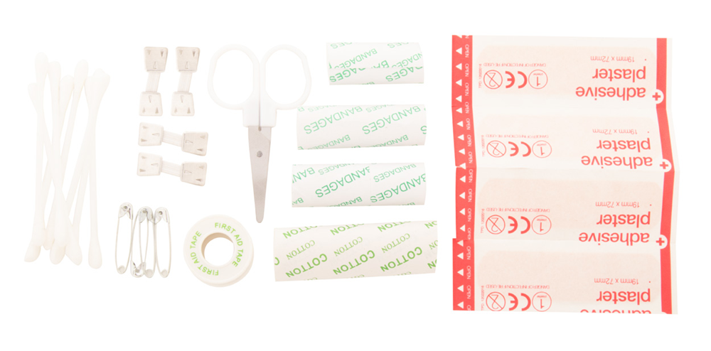 Kompaktes Erste-Hilfe-Set in weißer Kunststoff-Box. Das Set beinhaltet: 1 Schere, 1 Mullbinde (35x1000mm), 2 Mullbinden (45x1000mm), 1 Baumwollbinde, 1 Klebeband, 4 Sicherheitsnadeln, 4 Schnallen, 8 Wattestäbchen und 4 Pflaster.