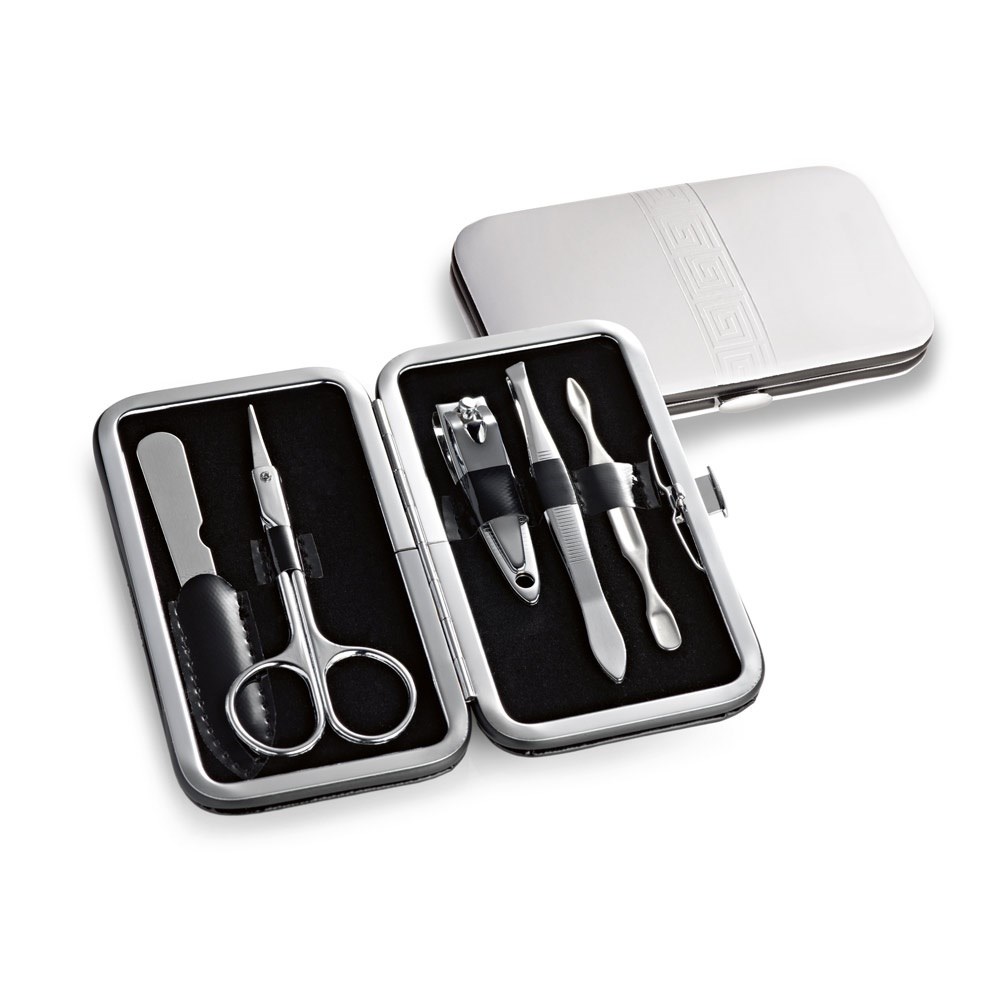 Maniküre-Set (5teilig) bestehend aus einer Nagelfeile, Nagelschere, Nagelzange, Pinzette, und einem Nagelhautschieber. Geliefert in einem Etui aus Lederimitation. 110 x 65 x 20 mm