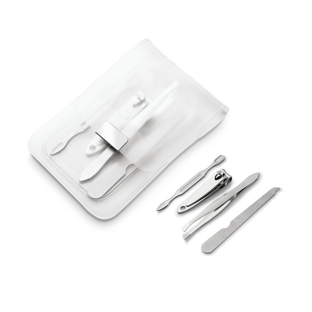 Maniküre-Set (4-teilig) in einem PVC-Beutel. Dieser beinhaltet eine Nagelfeile, eine Pinzette, eine Nagelzange und einen Nagelhautschieber. 66 x 105 mm