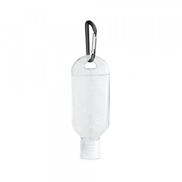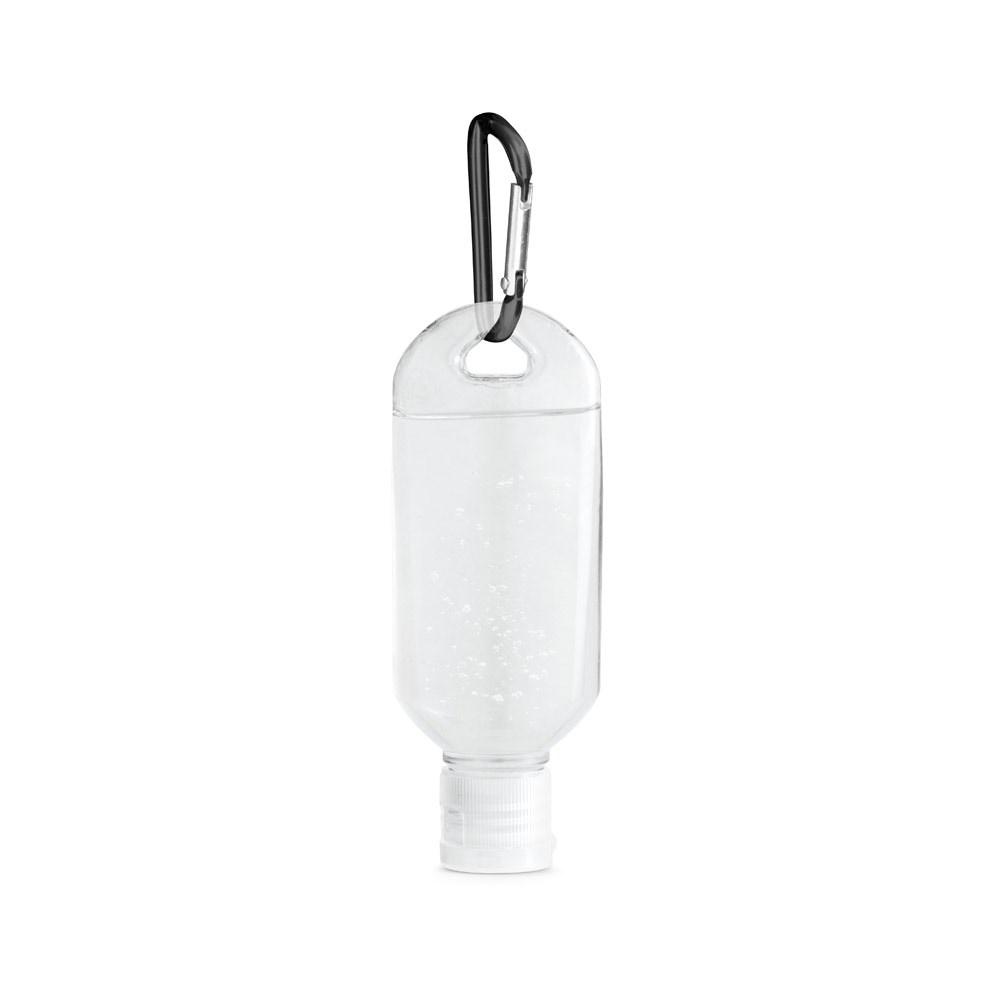 Handreinigungsgel mit 68% Alkoholgehalt in einem PETG Behälter (50 ml), einem Fliptop-Deckel und einem Karabiner. Es handelt sich um einen kosmetischen Artikel, der praktisch und handlich ist. Rechtliche Hinweise verfügbar in: [PT | EN | ES | FR | IT | DE | CZ | SK]. 45 x 120 mm